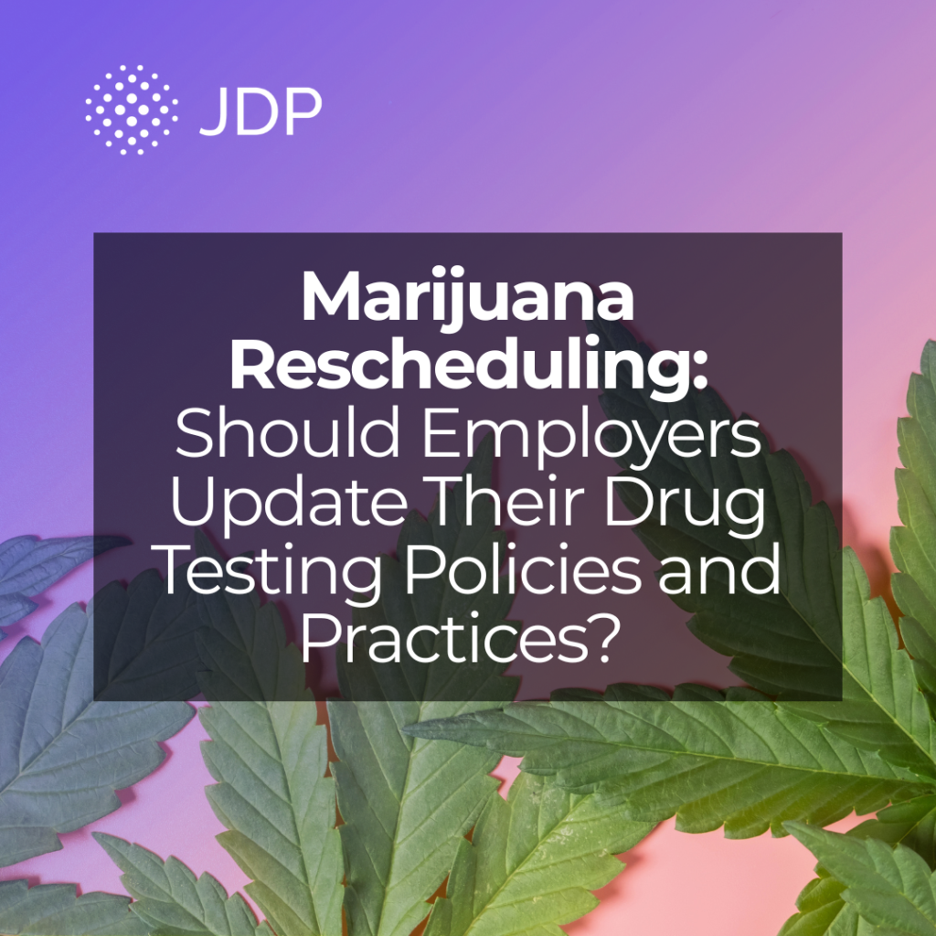 Many states and several localities have laws regulating drug policies and drug testing and providing protections to recreational and medicinal marijuana users. Accordingly, employers must be cognizant of the specific landscape for their work forces. Even after rescheduling, employers will still be able to prohibit marijuana use and impairment in the workplace. Employers with drug testing programs who test for marijuana (THC metabolites) will not be prohibited from doing so by the rescheduling (but must remain mindful of restrictions and other limitations per applicable state and local law).